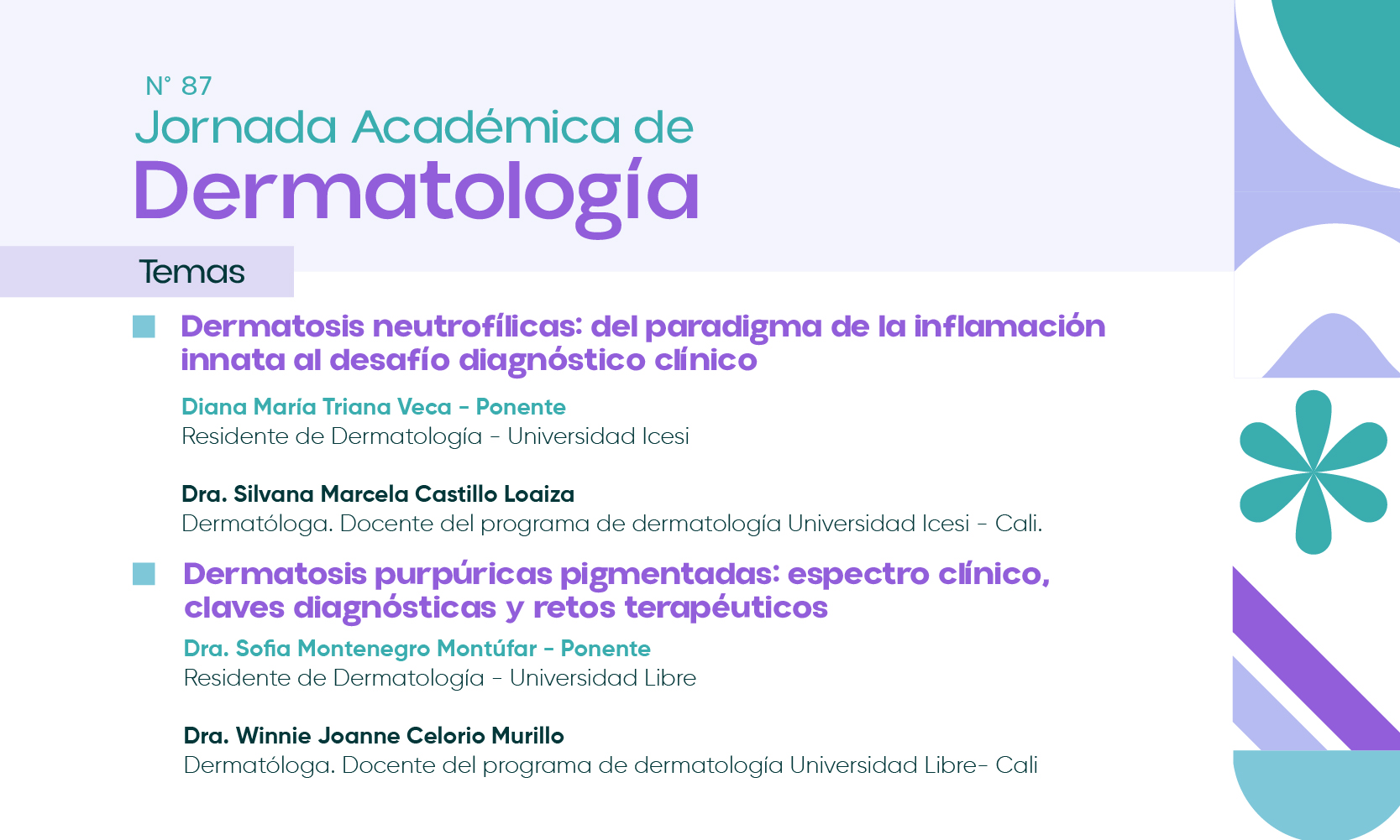 La Jornada Académica Virtual de Dermatología es un espacio de actualización científica diseñado para fortalecer el conocimiento en temas actuales y relevantes de la especialidad. A través de conferencias académicas lideradas por residentes y expertos en dermatología, este encuentro busca promover el aprendizaje continuo, el análisis clínico oportuno y el intercambio de experiencias que aporten a una mejor atención de los pacientes y al desarrollo profesional de la comunidad médica.